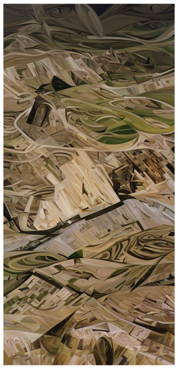 My paintings are made from images of the landscape that have been broken up, abstracted and fractured but nevertheless still retain the essence of the places that inspired them, their origins and their ongoing history. That they are both optimistic and apocalyptic is not a contradiction, only a true reflection of the potential humans have to alter their own environment and destiny. Through the nurturing of the land we have the optimism of sustainable life on this planet. Yet it is in the current climate of unsustainable economic activity, which seems hell bent on taking every last drop of life from the land, that we also have the apocalyptic vision.